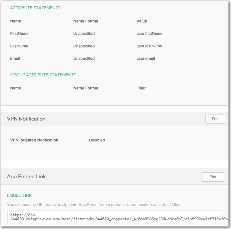 1. Logon to your identity provider platform’s web site and open the page containing your account’s SAML settings. The following are the SAML Settings in Okta: