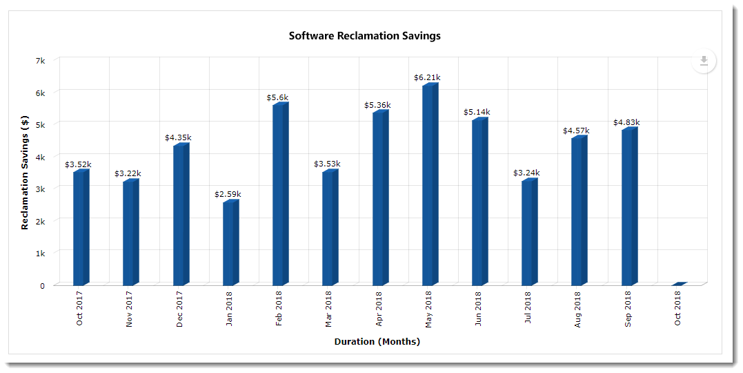 Each bar represents the total savings earned for that time frame, with the total cost displayed on the top of each bar. Hovering over any bar provides an enhanced view of the reclamation savings for the specified time frame.