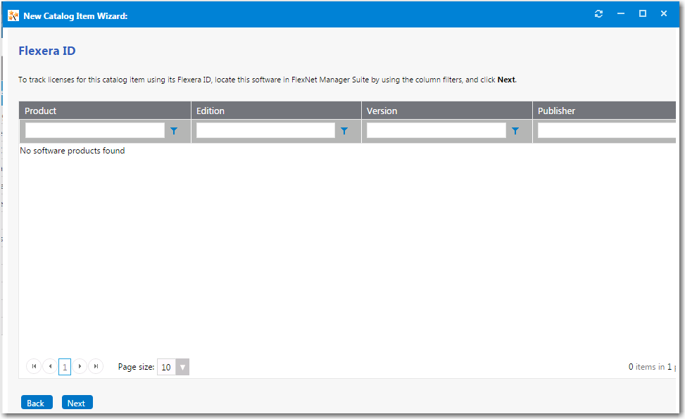 16. To track licenses for this catalog item using its Flexera ID, use the column filters to locate this application or package in FlexNet Manager Suite, select it, and click Next.