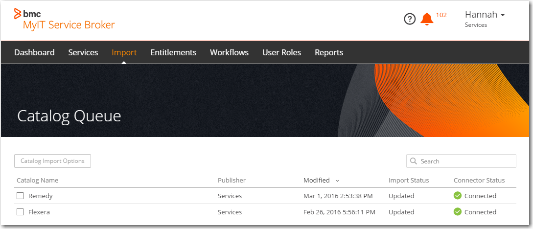12. Click the Import 1 Item button. The item is imported from App Portal to BMC MyIT, and the Catalog Queue page opens.