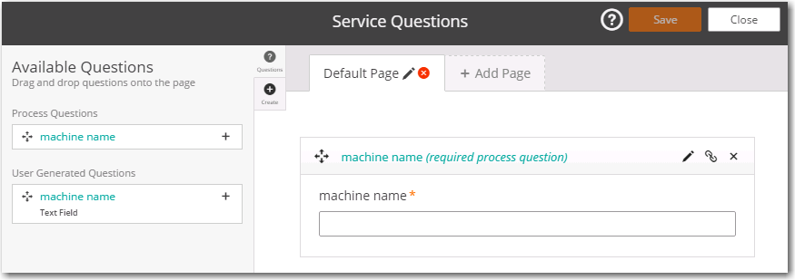 20. Click Save to close the Question Settings view. The Service Questions view opens, displaying the machine name field.